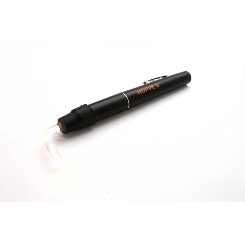 conditions. Hoppes light illuminates the bore fully, so nicks, scratches, pits and fouling can be seen easily. Hoppe Bore Lights are good for safety checks and for lighting hard-to-get-at areas. Locking feature of Hoppes Bore Flashlight can lock light on for longer inspections. Hoppes Bore-light is a good tool to take along if you're buying a used firearm. Bore Flash Light uses two AAA Batteries (Not Included)
