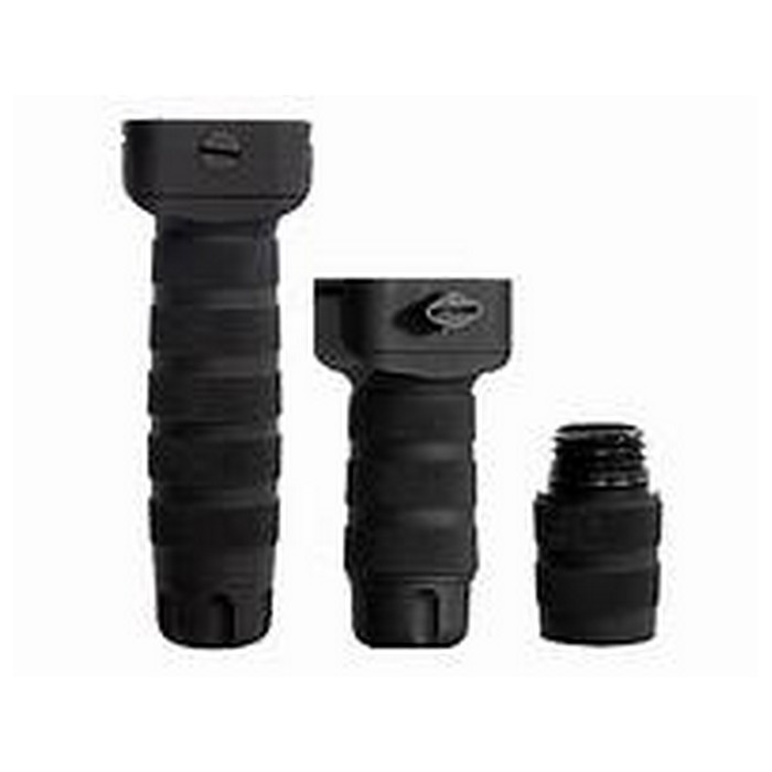 Troy Modular Combat Grips are machined from aircraft aluminum billet. The grip converts easily into two sizes. 4 5/8" when completely assembled. 3 1/4" when in short (stubby mode). low profile attachment screw included. Three part modular design. High capacity internal storage container.