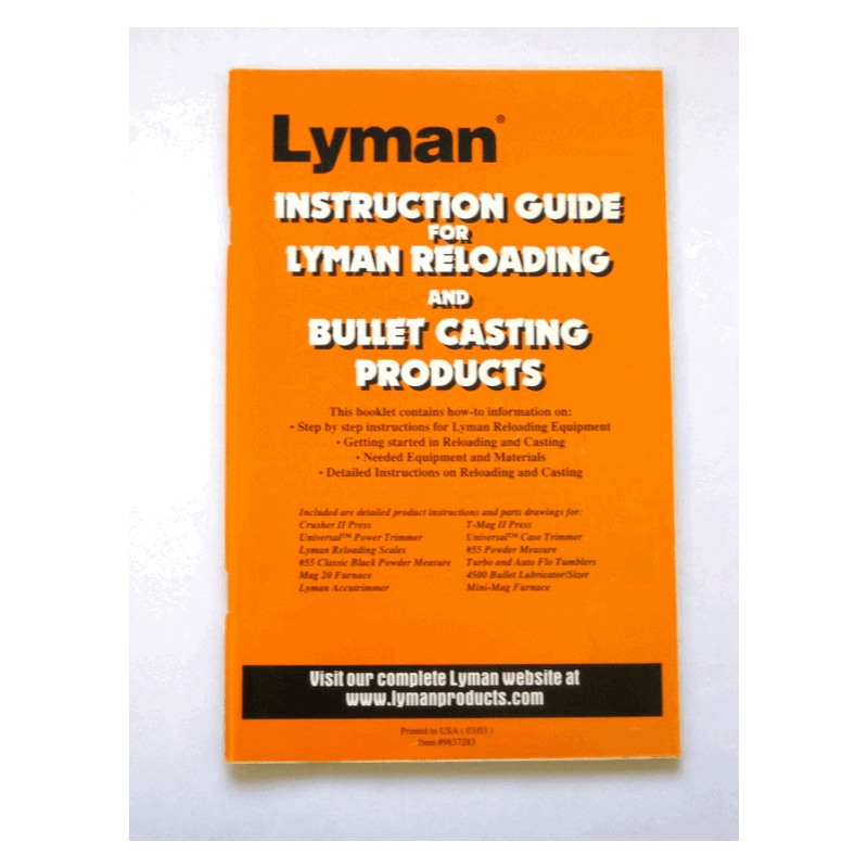 This booklet is filled with complete information on getting started in Reloading and Bullet Casting. It also includes detailed product instructions and parts drawings for Lyman presses, trimmers, scales, powder measure and tumblers.