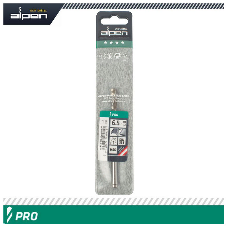 Alpen Pro HSS 6.5mm Drill Din 338 Rn 135 Split Point Plastic Wallet