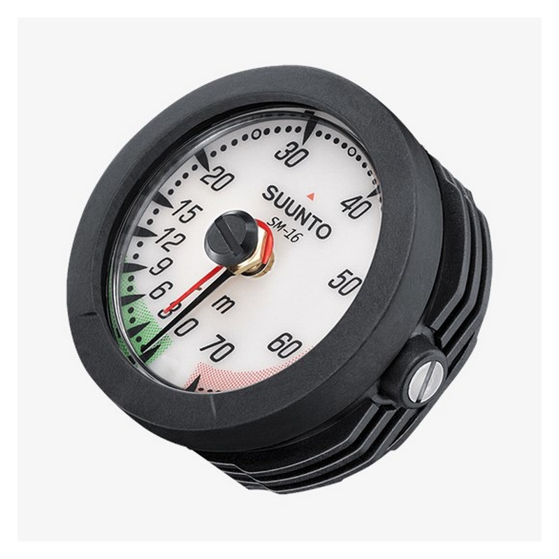 Suunto SM-16 depth gauge features a reliable Bourdon tube mechanism with a gear system, maximum depth indicator, zero-in facility for high altitude diving, and phosphorescent dial face.