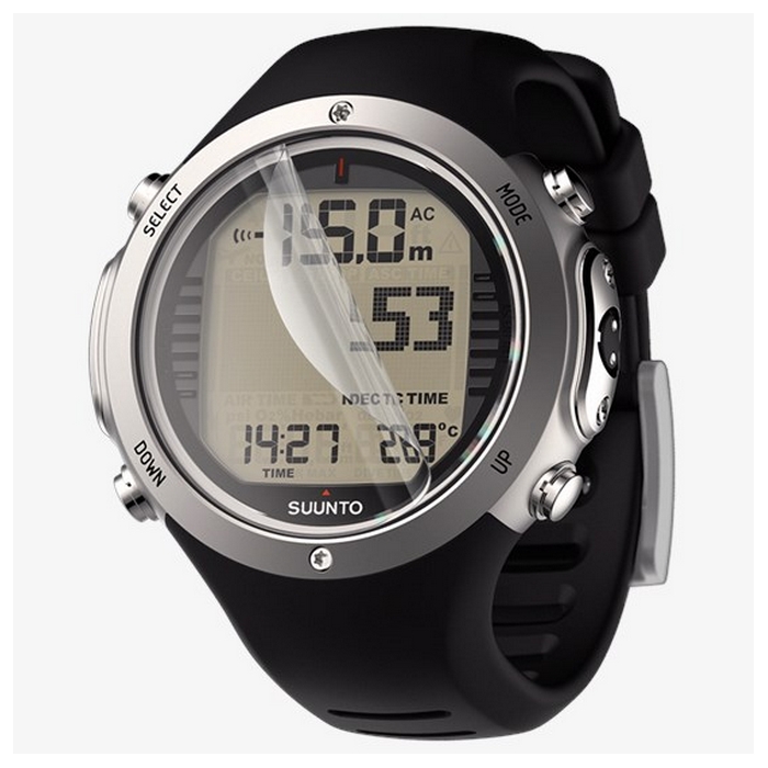 The adhesive scratch guard protects Suunto D-series dive computer displays without restricting the view. Each package includes two scratch guards and instructions.