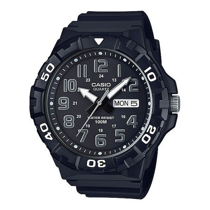 If you're searching for great value in a classic diver-look watch, look no further than the MRW200 from Casio. It's 44.6mm face and large indexes provide at-a-glance information. Couple this with a bi-directional rotating bezel and 100 meter water resistance and you've got a timepiece that's easy-to-read, simple-to-use and durable.