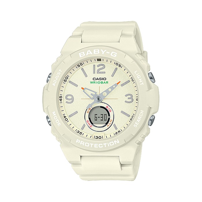 This collection for women who enjoy unfettered travels in the great outdoors provides a selection of vintage styles that look great with today's outdoor fashions. Faded vintage-like basic hues are highlighted by neon colors to create styles that look great at festivals, campsites, and just about any other outdoor venue. The shape of the hour hand resembles the outline of an oil lantern for a look that is playful and fun. Button functions are clearly marked on the bezels, and the tips of the hour and minute hands are coated with luminescent paint. LED light face illumination also provides easier reading in the total darkness of outdoor scenes. These new BABY-G models are just the thing for today’s bold and natural outdoor styles.