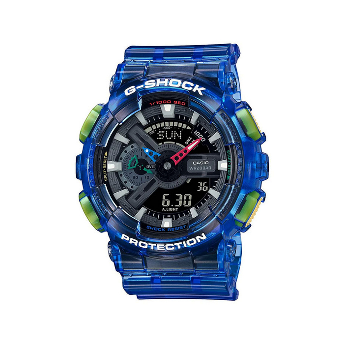 Jump with joy into the retrofuture with a translucent G-SHOCK in vibrant colors. The future as envisioned in the past comes to life in pop colors and translucent materials, accented with bright touches of primary color. Choose your favorite — the classic digital DW-6900 with its distinctive front button design, the DW-5900 with its triple graph, or the GA-110 with popular large face design.