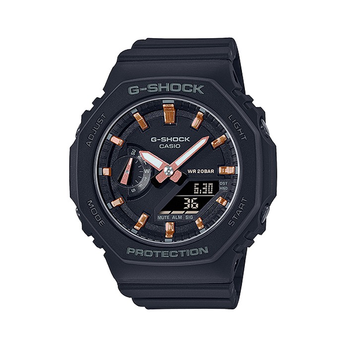 The octagonal bezel, flat face, simple bar hour markers, and carbon core guard structure that are distinctive features of the GA-2100 are now available in a compact configuration.