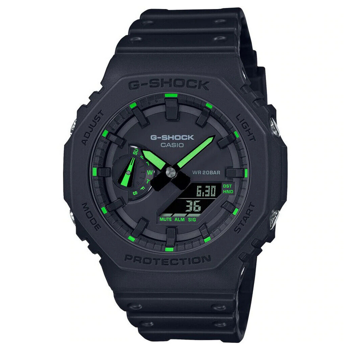 Casio G-Shock men's watch with digital analog format. Make a splash with this matte black set in a custom design featuring neon accents. The octagonal shape and sleek design of the GA-2100 features a textured matte black and bright neon colors for a cool and stylish new look. The hour and minute hands of fluorescent paint stay visible in the dark to keep you playing all day and night.