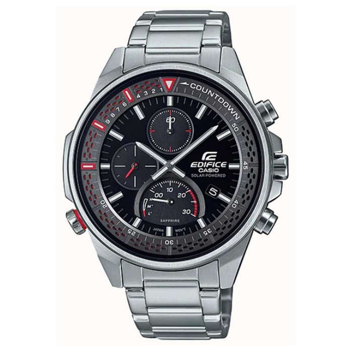 Introducing slim, sporty, solar-powered EFS-S590 Series chronographs. The sporty design of these multi-hand chronographs come packed in a case that is only 9.9mm thick for a comfortable fit. An inner rotary ring contributes to the sporty design of these watches. A countdown feature comes in handy for racing team members who need to keep track of a large number of time-critical events.