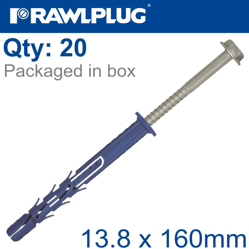 RAWLPLUG Nyl Frame Fixing Zp + Collar Hex Screw 13.8Mmx160Mm X20 -Box