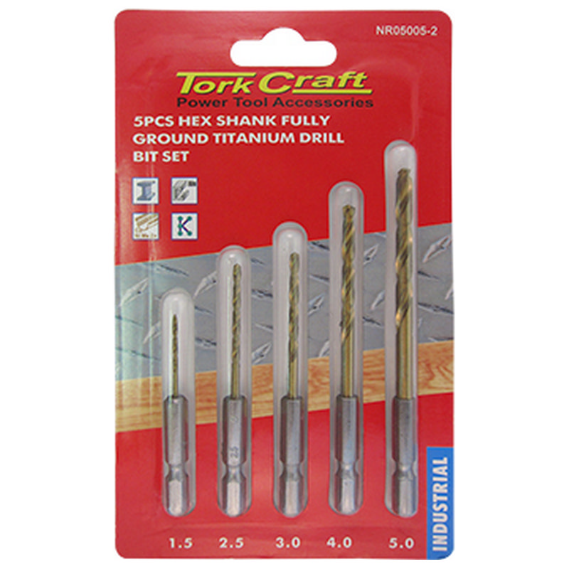 Tork Craft Drill Bit Set 5pcs Fully Ground,Titanium Hex Shank 1.5/2.5/3/4/5mm