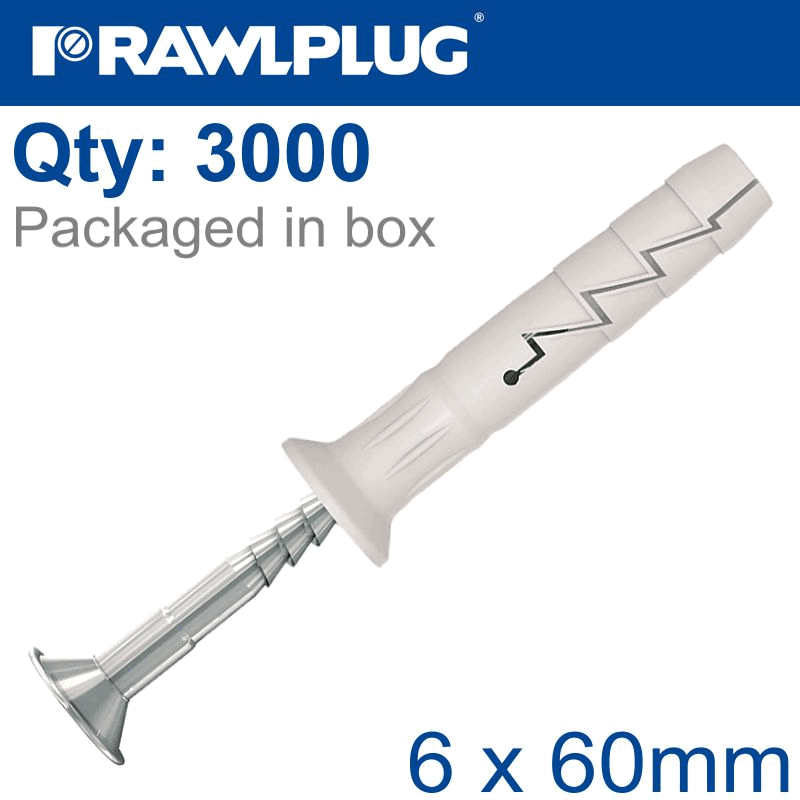 RAWLPLUG Nyl Hammer-In Fixing 6X60Mm+ Csk Head X3000 Per Box