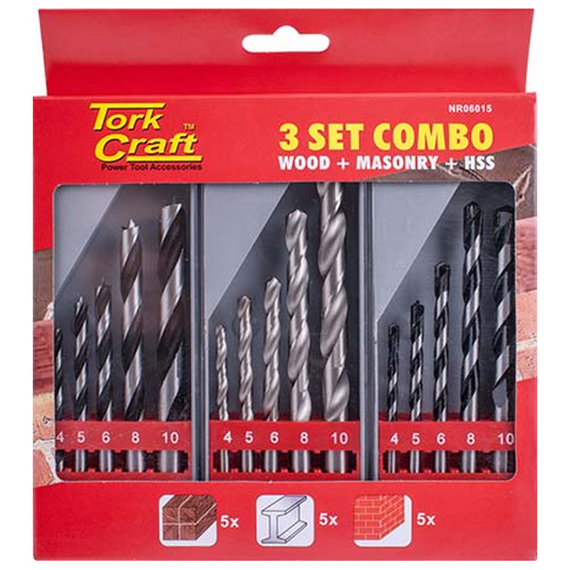 Tork Craft Drill Bit 3 Set Combo Wood + Masonry + Hss