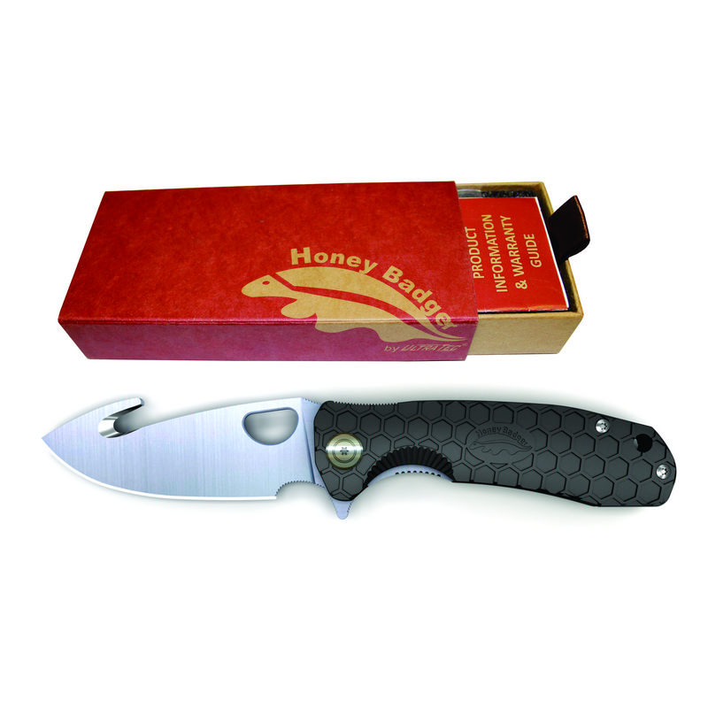 Technically, a gut hook is more of a blade feature as included on a blade, than a blade shape itself. Gut-Hooks usually appear as a small, sharpened hook-like curve that interrupts the spine as it slopes toward the point. These have one main use: field dressing wild game. The design of the hook allows hunters to cut through an animal’s skin without piercing or damaging what lies under it. Honey Badger’s specific gut-hook design features exactly the same cutting-edge profile as the drop point Flipper model, but with an added gut-hook for the field dressing of game.