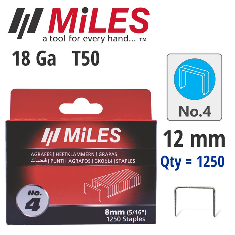 Miles Galvinised Staples 18g T50 12mm X 1250pcs Miles No4