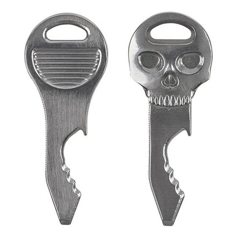 The doohickey quickey and skullkey tools are simple, key-shaped tools that attach to your key ring, so they're always at hand when you need them. This product's clever design incorporates each of the following functions: a file, a #2 flat-head screwdriver, a scoring point (great as a box cutter and for easily opening clamshell packages), a serrated edge (to saw through twine and clothing tags), and, finally, of course, a bottle opener (because you always want a bottle opener!). Made of durable stainless steel, the doohickey quickey and skullkey tools are travel and airport friendly, and, because of their endless uses, endlessly useful.