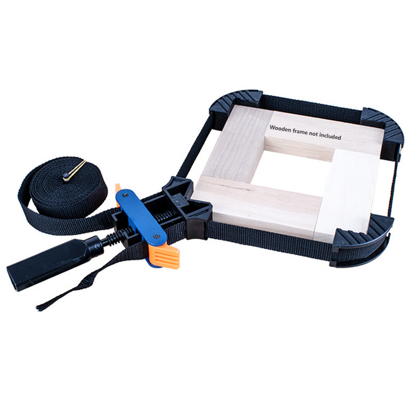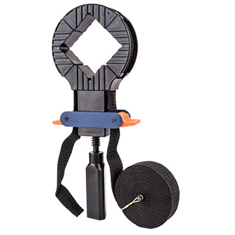 The quick-adjust band clamp provides even pressure when clamped on a variety of shapes and sizes of workpieces. The length of the band clamp is 4m and it includes (x4) 90° corner pieces.
