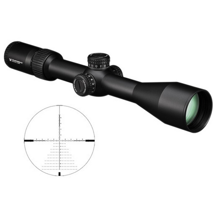 Vortex Optics designed and built the 6-24x50 Diamondback Tactical Riflescope to meet the needs of tactical professionals, but with easy usability for hunters. Its broad zoom range makes it ideal for mid- to long-range use, while the 50mm objective draws in the large amount of light required to keep views bright and clear in challenging conditions—such as during the dawn and dusk hours—or when focusing on small subjects at long range with the magnification dialed to maximum. Extra-low dispersion XD glass and anti-reflection fully multi-coated optical surfaces complement the magnification range and objective by transmitting bright and clear high-contrast views with accurate color and improved edge-to-edge contrast and resolution.