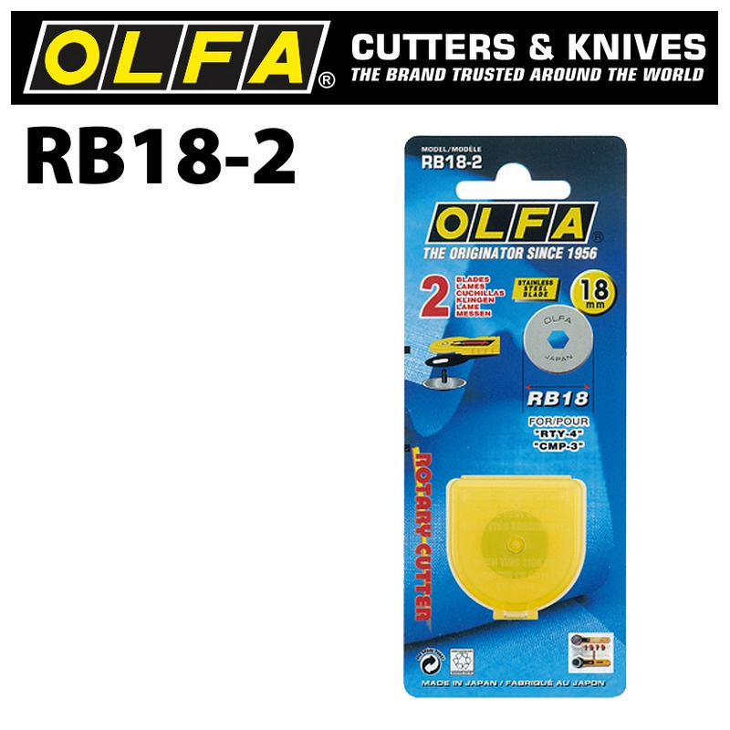 For use with the 18mm Rotary Cutter (RTY-4) and Rotary Circle Cutter (CMP-3). 2 blades per pack. (RB18-2)