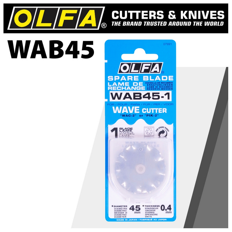 This durable, stainless steel blade has a razor-sharp edge. Wave edging is very popular among people making crafts such as memory books and scrapbooks. The blade is designed to be used with only the OLFA® 45mm Deluxe Rotary Cutter (RTY-2/DX). (WAB45-1)