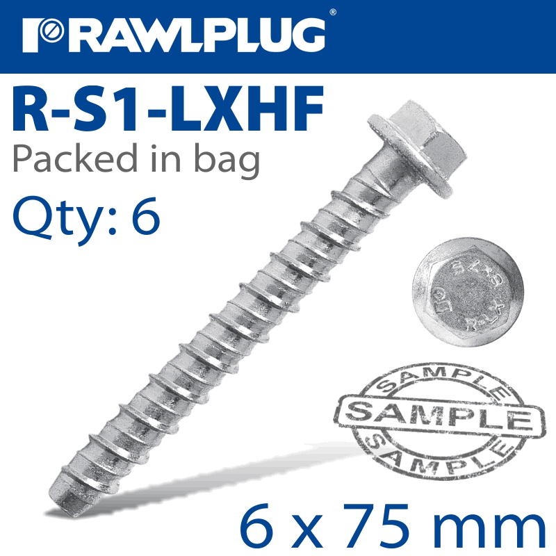RAWLPLUG Concrete Screw Bolt 7.5X75Mm R-Lx Hex + Flange X6 -Bag
