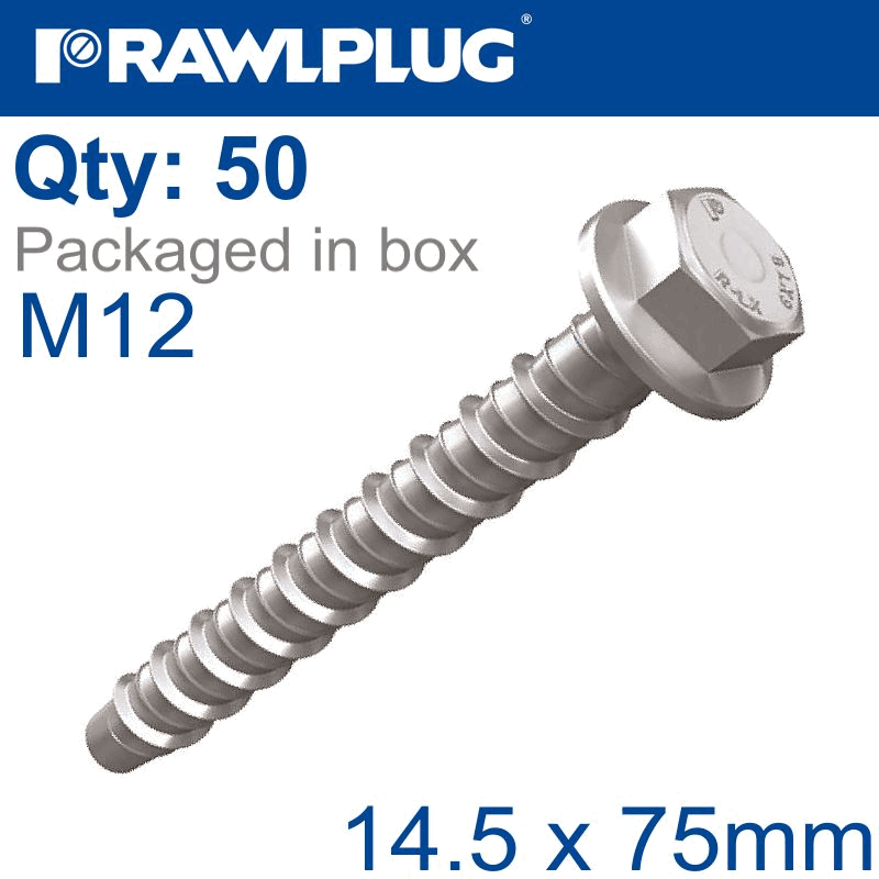 RAWLPLUG Concrete Screwbolt M12 14.5X75Mm Hex Head With Flange Galv Box Of 50