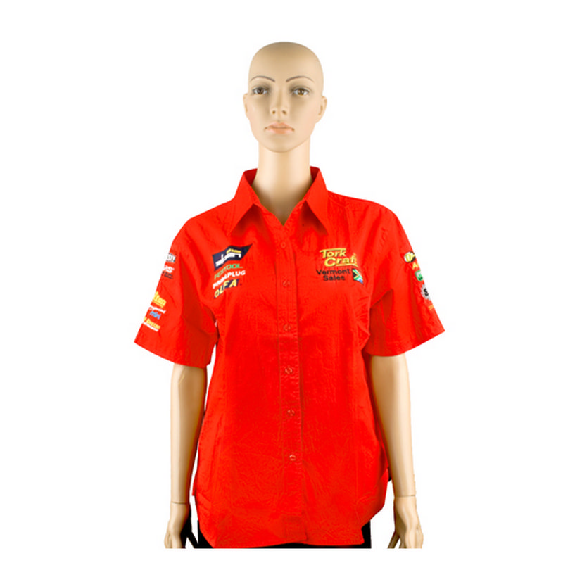 The blouse represents the Vermont Sales company. The leading brands are embroidered on the sleeves and the chest.