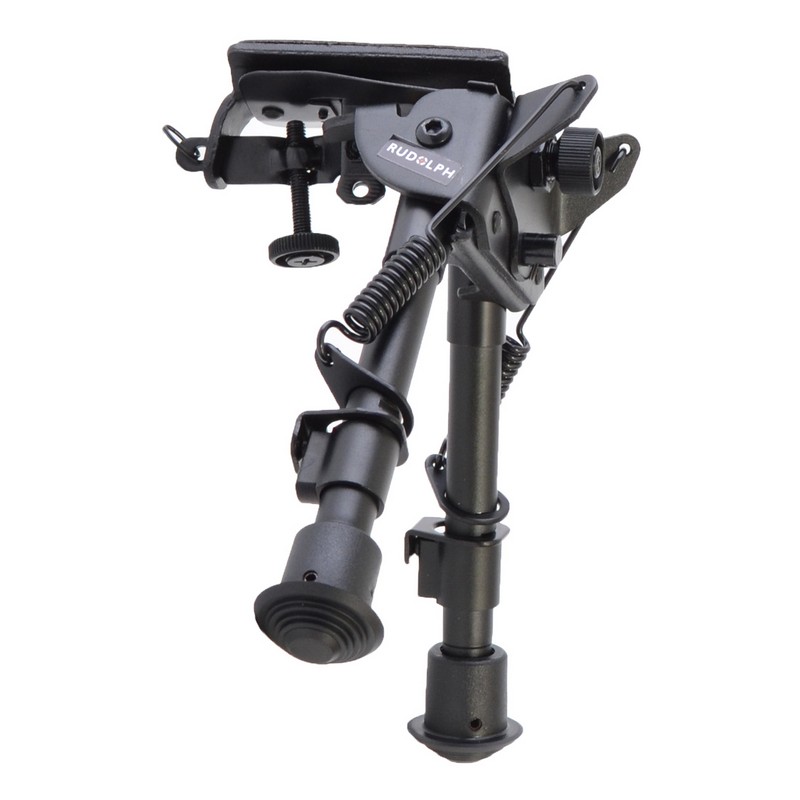 The Rudolph 9" - 13" Black Aluminum Swivel Pivot Bipods with adjustable, spring loaded legs provide a stable shooting suport that attaches to almost any firearm with a sling swivel stud. The lightweight aluminum design, with legs that instantly pop out to the shooting position with a touch of a button, are notched for setting to a specific height. (9-13 Inches) Threre is a sling swivel attachment and legs that swing forward allowing for convenient carry of the rifle. The soft rubber feet provide enhanced stability for optimal accuracy, while the rubber pad protects the rifle's stock.