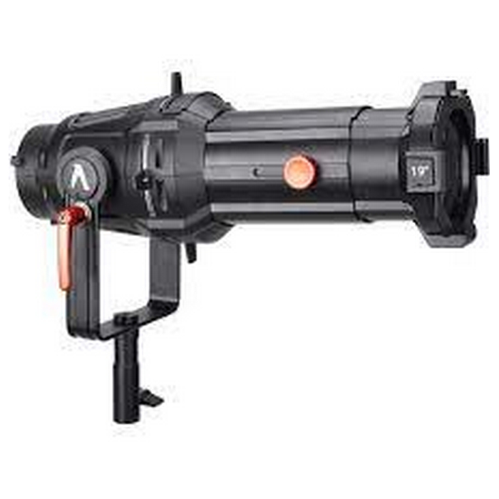 Offering a high degree of control, this Aputure Spotlight Mount Set is a versatile light modifier with an included 36° lens for producing a dramatic yet clean beam of light. Featuring a Bowens mount, this modifier can be easily attached to a variety of lights, including the Light Storm LC 120d II, 120D, and 300D, and its integrated yoke has a dual junior/baby mount for attaching to anything from a C-stand to a lighting grid. The Spotlight's design incorporates a dual drop-in slot, which can accept the included B-size gobo holder, included gel holder, or an optional adjustable iris for further control over the shape and size of the light beam. Like a conventional ellipsoidal light, too, the lens can be easily swapped in order to achieve a different beam angle. The Spotlight Mount has a durable aluminum alloy housing and this kit is delivered in a hard travel case to protect the housing, lens, and accessories during transport.