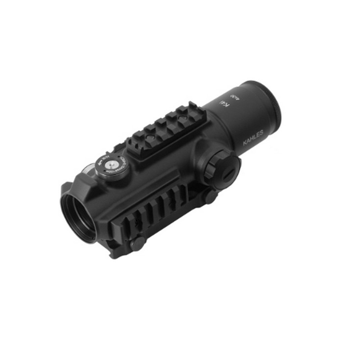 The compact, durable Kahles K4i 4x30 scope with a circle dot reticle is optimized for rapid target engagement within medium to short range. It ha a precise 1.5cm/100m click adjustment and an integrated picatinny mounting rail.